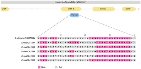 The 40 amino acid residues of the DQA gene from the eight alleles identified in this study exhibited high similarity to DQA allele sequences from the family Elephantidae available in the GenBank database, with a mean pairwise similarity exceeding 70%. Protein sequence homology analysis further revealed that the exon 2 region of these alleles shared a high degree of similarity with sequences from Asian elephants, African bush elephants, and wooly mammoths, with query coverage ranging from 75% to 98%. These alleles are located in the α domain of the Class II histocompatibility antigen domain in the antigen-binding region (ABR). Phylogenetic analysis based on the amino acid sequence alleles showed no clustering by species or population in DQA alleles of the family Elephantidae (Figure S1). Secondary structure prediction indicated that the region corresponding α domain of the Class II histocompatibility antigen was primarily composed of α-helix and coil structures (Figure 3).