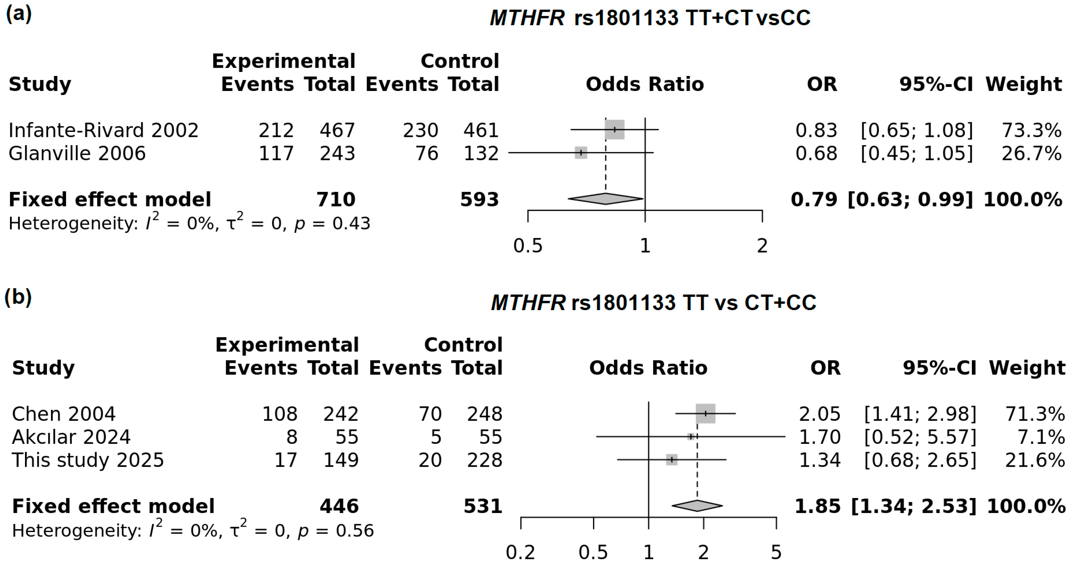 - Vafapour, M.; Talebi, H.; Danaei, M.; Yeganegi, M.; Azizi, S.; Dastgheib, S.A.; Bahrami, R.; Pourkazemi, M.; Jayervand, F.; Shahbazi, A.; et al. Global and population-specific association of MTHFR polymorphisms with preterm birth risk: A consolidated analysis of 44 studies. BMC Pregnancy Childbirth 2025, 25, 230. [Google Scholar] [CrossRef]