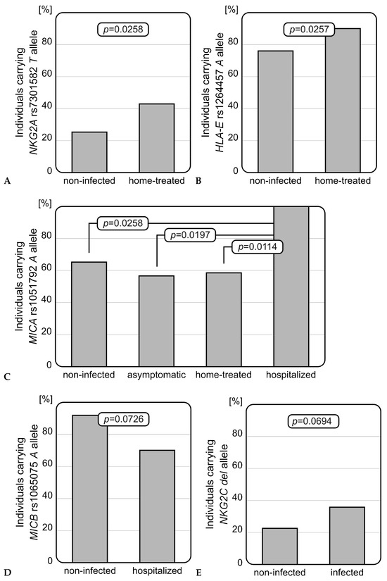 Significant relationships observed for selected polymorphisms. (A) NKG2A rs7301582 polymorphism in COVID-19 severity: the rs7301582 T allele was more frequently detected among infected individuals who received home treatment than in non-infected subjects. (B) HLA-E rs1264457 polymorphism in COVID-19 severity: rs1264457 A allele was more frequently present among home-treated patients than healthy individuals. (C) MICA rs1051792 polymorphism in COVID-19 severity: rs1051792 A allele was most common among hospitalized patients, when compared with non-infected individuals or patients with mild infection. (D) MICB rs1065075 polymorphism in COVID-19 severity: rs1065075 A allele was less frequently detected among hospitalized patients. (E) Difference in NKG2C deletion frequency between non-infected and infected individuals: patients with diagnosed SARS-CoV-2 infection carried the NKG2C del variant more frequently.