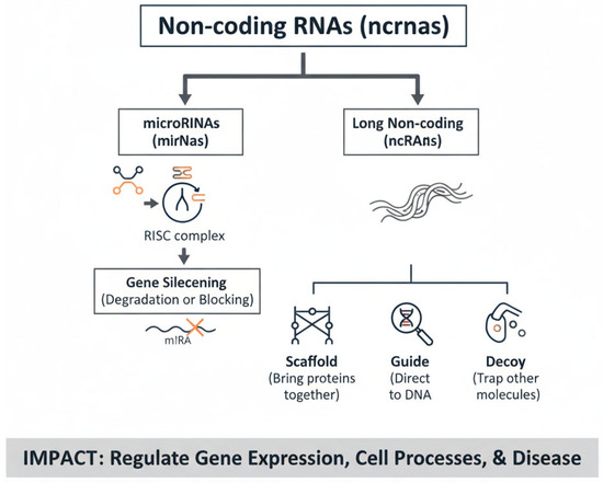 The completion of the human genome sequencing project in 2001 marked a pivotal milestone in biomedical research, initiating extensive efforts to understand the function of human genes. Initially, scientists believed that the majority of the human genome consisted of protein-coding genes responsible for producing the proteins essential to cellular function. However, a major breakthrough came with the discovery that only about 2% of the genome actually encodes proteins. This finding fundamentally changed our understanding of genomic architecture, highlighting the vast proportion of the genome composed of non-coding regions whose functions were previously unknown. This revelation has since driven intense research into the roles of non-coding elements, such as regulatory RNAs and other genomic sequences, reshaping our view of gene regulation and complexity in human biology. However, research has demonstrated that approximately 80% of the human genome is actively transcribed into RNA molecules, far exceeding the proportion of protein-coding sequences [23,24]. The ENCODE Project Consortium 16 provided comprehensive evidence that the vast majority of these transcripts do not translate into proteins. Instead, they belong to a diverse group of non-protein-coding RNAs, which play critical regulatory roles in gene expression, chromatin structure, and cellular function. This discovery has shifted the focus of genomic research toward understanding the various classes of ncRNAs—including microRNAs, long non-coding RNAs, and others—and their involvement in health and disease, highlighting their potential as diagnostic markers and therapeutic targets [21,25]. The family of ncRNAs represents a large and heterogeneous group of RNA molecules that perform a wide array of regulatory and structural functions within the cell [13]. By widely accepted convention, an ncRNA is classified as either long or short based on its length, with the cutoff typically set at 200 nucleotides. RNAs longer than this threshold are defined as long non-coding RNAs (lncRNAs), while those shorter are considered small non-coding RNAs (sncRNAs). The small ncRNA category includes various subtypes such as small nuclear RNA (snRNA), small nucleolar RNA (snoRNA), repeat-associated small interfering RNA (rasiRNA), small cytoplasmic osteosarcoma RNA (scoRNA), microRNA (miRNA), small interfering RNA (siRNA), piwi-interacting RNA (piRNA), and transcription initiation RNA (tiRNA) [21,25,26] (Table 1).