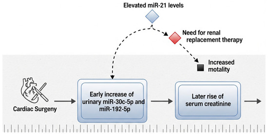 In patients who develop AKI following cardiac surgery, significant elevations in urinary levels of miR-30c-5p and miR-192-5p have been observed as early as two hours after the surgical procedure. This early increase suggests a potential role for these microRNAs as sensitive biomarkers for the prompt prediction of postoperative renal injury, possibly preceding changes in conventional markers such as serum creatinine [61]. Their rapid response to renal stress underscores their clinical utility in enabling timely diagnosis and facilitating early intervention. Additionally, research by Du et al. has emphasized the prognostic value of both urinary and plasma miR-21 levels in the postoperative setting. Elevated miR-21 concentrations were found to be associated with an increased likelihood of requiring renal replacement therapy (RRT), extended hospitalization, and higher 30-day in-hospital mortality rates [62]. These findings support the integration of miRNA profiling into postoperative risk assessment models, as it may enhance clinicians’ ability to identify high-risk patients and guide decisions regarding intensive monitoring and early therapeutic strategies (Figure 2).