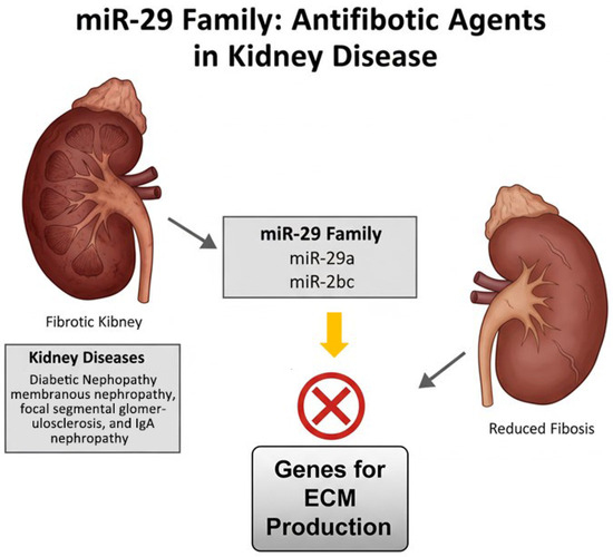 Conversely, miR-29 family members—including miR-29a, miR-29b, and miR-29c—have been identified as potent antifibrotic agents in various kidney diseases such as diabetic nephropathy, membranous nephropathy, focal segmental glomerulosclerosis, and IgA nephropathy. These microRNAs help inhibit fibrotic processes by targeting genes involved in extracellular matrix production and deposition, thereby mitigating tissue scarring and preserving renal function [70] (Figure 3).