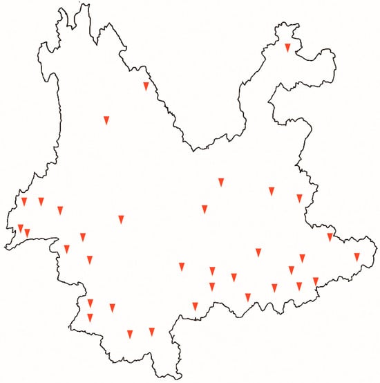 Figure 1. Sampling map of Yunnan Province depicting the distribution of sampled counties, derived from administrative boundary data provided by the National Geomatics Center of China under map review number YunS(2021)46 (http://bzdt.ch.mnr.gov.cn/, accessed on 20 July 2025). Counties with sampling sites are marked by red inverted triangles.