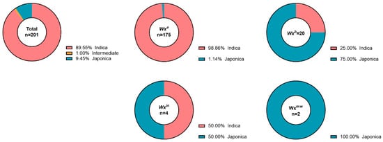 InDel markers classified 180 indica (121 typical indica, 53 indica, 6 indica-leaning), 2 intermediate, 19 japonica (2 japonica-leaning, 9 japonica, and 8 typical japonica). Wxa occurred in 175 indica types; Wxb in 15 japonica and 5 indica; Wxin in 2 indica and 2 japonica; Wxmw in 2 japonica. A chi-square test showed a highly significant association between Waxy genotype and rice type (χ2 = 197.3, df = 18, p < 0.001). Wxa was mainly found in Indica (95.4%, including both typical indca and indca), while Wxb was more common in Japonica (75.0%, including both typical japonica and japonica), indicating a strong correlation between Waxy genotype and rice type (Figure 3, Table 2 and Table S6).