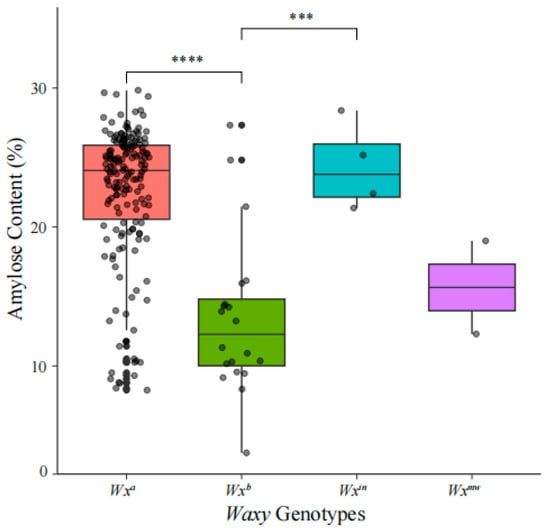 3.4. Statistical Analysis Between Different Waxy Genotypes and Their Amylose Content