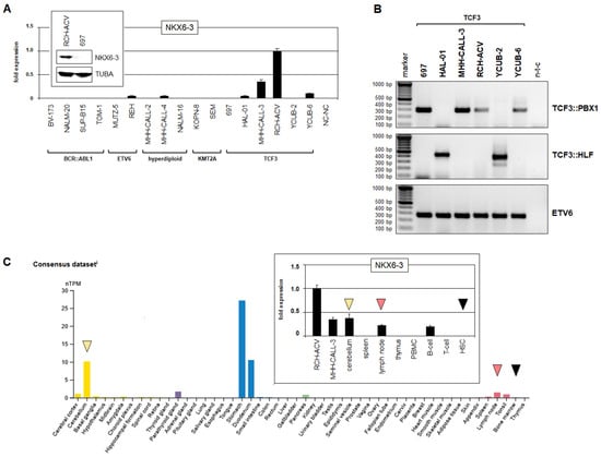 NKX6-3 expression in TCF3::PBX1-positive BCP-ALL. (A) RQ-PCR analysis of NKX6-3 in BCP-ALL cell lines, which are ranked according to reported subgroups BCR::ABL1, ETV6, hyperdiploid, KMT2A and TCF3 (above). The highest expression level was detected in RCH-ACV and set as 1. Western blot analysis confirmed NKX6-3 expression in RCH-ACV; TUBA served as loading control (insert). (B) RT-PCR analysis of TCF3-group BCP-ALL cell lines for fusion genes TCF3::PBX1 (above), TCF3::HLF (middle) and ETV6 (below), which served as positive control. (C) Public RNA-seq data (obtained from the Human Protein Atlas) for NKX6-3 in selected tissues. Arrowheads highlight the tissues cerebellum (yellow), lymph node (red) and bone marrow (black). RQ-PCR analysis of NKX6-3 in cell line RCH-ACV and selected primary tissues and cell types (insert). Arrowheads highlight cerebellum (yellow), lymph node (red) and hematopoietic stem cells (HSCs, black). PBMC: Peripheral blood mononuclear cells. The data were generated in triplicate (A,B) or in duplicate (C).