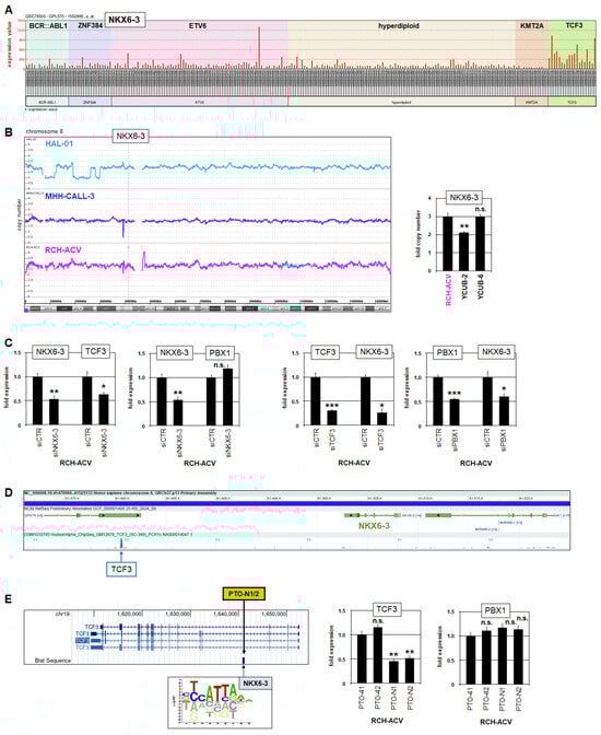 Expression and regulation of NKX6-3 in BCP-ALL. (A) Public gene expression profiling data for NKX6-3 from pediatric BCP-ALL patients (dataset GSE79533). The patients are ordered according to the subtypes BCR-ABL1, ZNF384, ETV6, hyperdiploid, KMT2A and TCF3. (B) Genomic copy numbers for chromosomes 8 using genomic profiling data from cell lines HAL-01, MHH-CALL3 and RCH-ACV (left). The NKX6-3 locus is indicated. RQ-PCR analysis of NKX6-3 copy numbers in RCH-ACV, YCUB-2 and YCUB-6 (right). (C) RQ-PCR analysis of NKX6-3, TCF3 and PBX1 transcripts in RCH-ACV after siRNA-mediated knockdowns. (D) Public ChIP-seq data for TCF3 (ENCODE project) showing binding of TCF3 at the locus of NKX6-3 in lymphoblastoid cell line GM12878. (E) A search for potential NKX6-3 binding sites at the locus of TCF3 revealed a site in intron 3 as indicated, using genome browser UCSC and data from the CIS-BP database (left). RQ-PCR analysis of TCF3 and PBX1 expression in RCH-ACV after performing enhancer inhibition using PTO-modified oligonucleotides targeting the indicated NKX6-3 binding site. PTO-41 and PTO-42 served as negative controls. The data were generated in triplicate (B,C) and duplicate (E). Statistical significance was assessed by t-test (two-tailed) and the calculated p-values are indicated by asterisks (* p < 0.05, ** p < 0.01, *** p < 0.001, n.s. not significant).