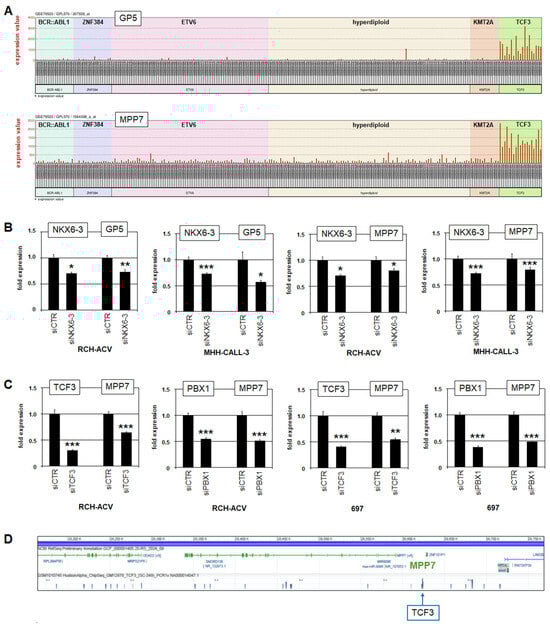 RQ-PCR analysis of GP5 and MPP7 after NKX6-3 knockdown in RCH-ACV and MHH-CALL-3 confirmed that NKX6-3 activated their expression (Figure 5B). GP5 encodes a glycoprotein which is associated with the VWF-receptor, and MPP7 a component of the HIPPO-pathway [,]. Recently, this pathway has been shown to play a role in BCP-ALL and may, therefore, be of heightened interest [,,]. Therefore, as performed for CD109 (see above), we analyzed RCH-ACV and 697 cells after treatment for knockdown of TCF3 and PBX1. This approach showed that TCF3 and PBX1 activated MPP7 in both cell lines (Figure 5C). Thus, MPP7 is an activated target gene of both TCF3::PBX1 and NKX6-3. In conclusion, these data may indicate that HIPPO-pathway activation is physiologically conducted via NKX6-3 in BCPs and aberrantly via TCF3::PBX1 in BCP-ALL. Analysis of potential NKX6-3 binding sites at MPP7 locus revealed a highly conserved NKX6-3-site within a 20 kb upstream regulatory region (Figure S5), suggesting direct regulation. In addition, public ChIP-seq data obtained from the ENCODE project show binding of TCF3 at the locus of MPP7 [] (Figure 3D), supporting direct regulation via fusion protein TCF3::PBX1.