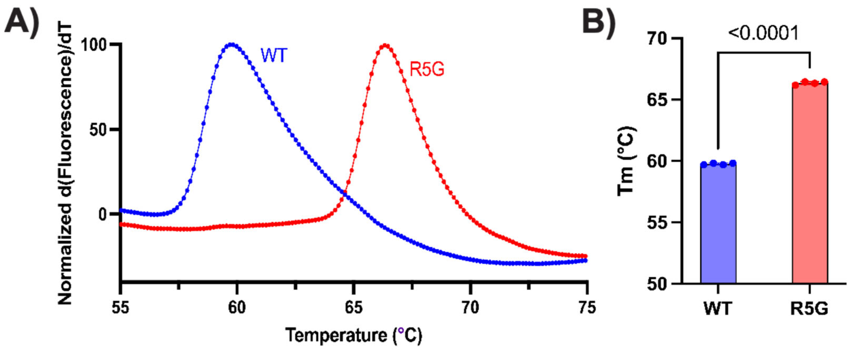 Protein Thermal Shift Assay (PTS) was performed with a final protein concentration at 0.7 mg/mL for both TPI wildtype and R5G mutant in a reaction buffer of 20 mM HEPES pH 7.5, 150 mM NaCl, 10 mM Tris pH 8.8, 5% glycerol, and 1 mM β-ME. The hydrophobic dye added was 0.5X GloMelt. Four technical replications were run for each assay and the thermal gradient was applied from 30 to 95 °C using a Thermo-Fisher Quantstudio-3 Real-Time PCR machine (Thermo Fisher Scientific, Waltham, MA, USA). Fluorescence of GloMelt and ROX dye were measured, and the maximum derivative of fluorescence was used to define melting temperature (Tm).