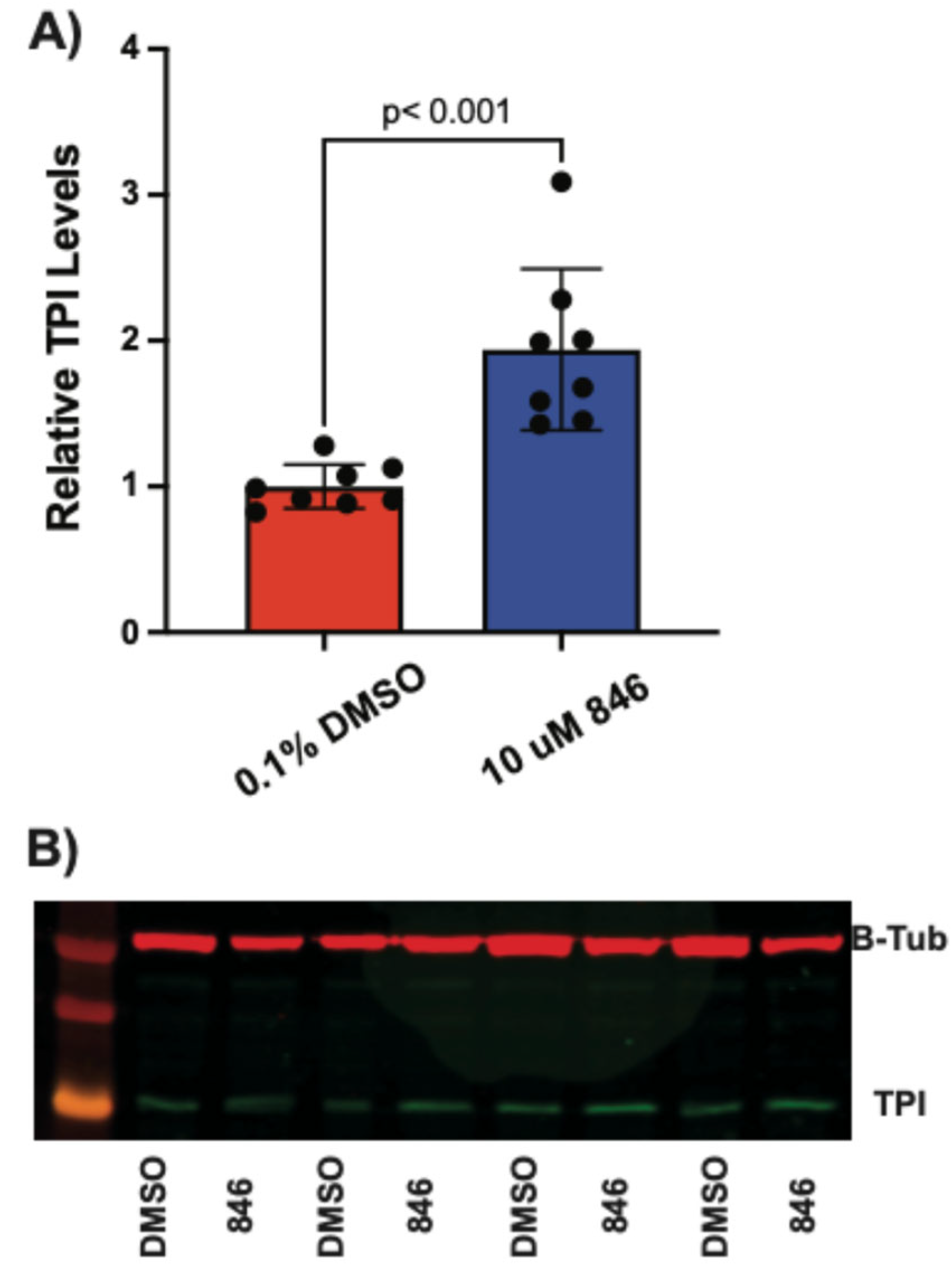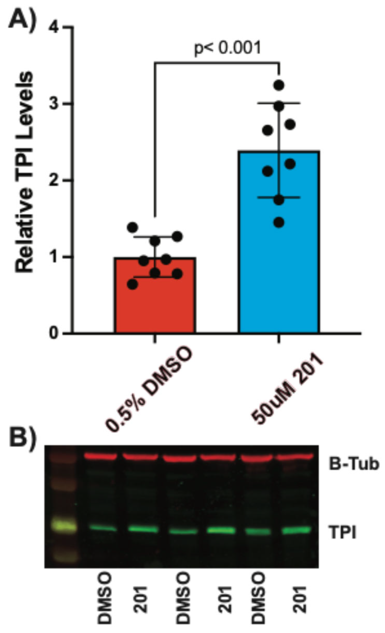 Cells were treated with compound 201 (50 µM), 424 (50 µM), 846 (10 µM), or DMSO as described in the TPI Activity section above. Cells were lysed and analyzed for protein content by the BCA method as described above, except that a RIPA lysis buffer with protease inhibitors was used. The trypsin 10% FBS DMEM supernatant was aspirated off and the pellet was resuspended in PBS. The resuspension was centrifuged at 3000× g for 5 min. The supernatant was aspirated off and the cell pellet was resuspended in 120 μL of RIPA buffer + protease inhibitor solution. The resuspension was transferred to 1.5 mL microcentrifuge tubes and kept at −80 °C.