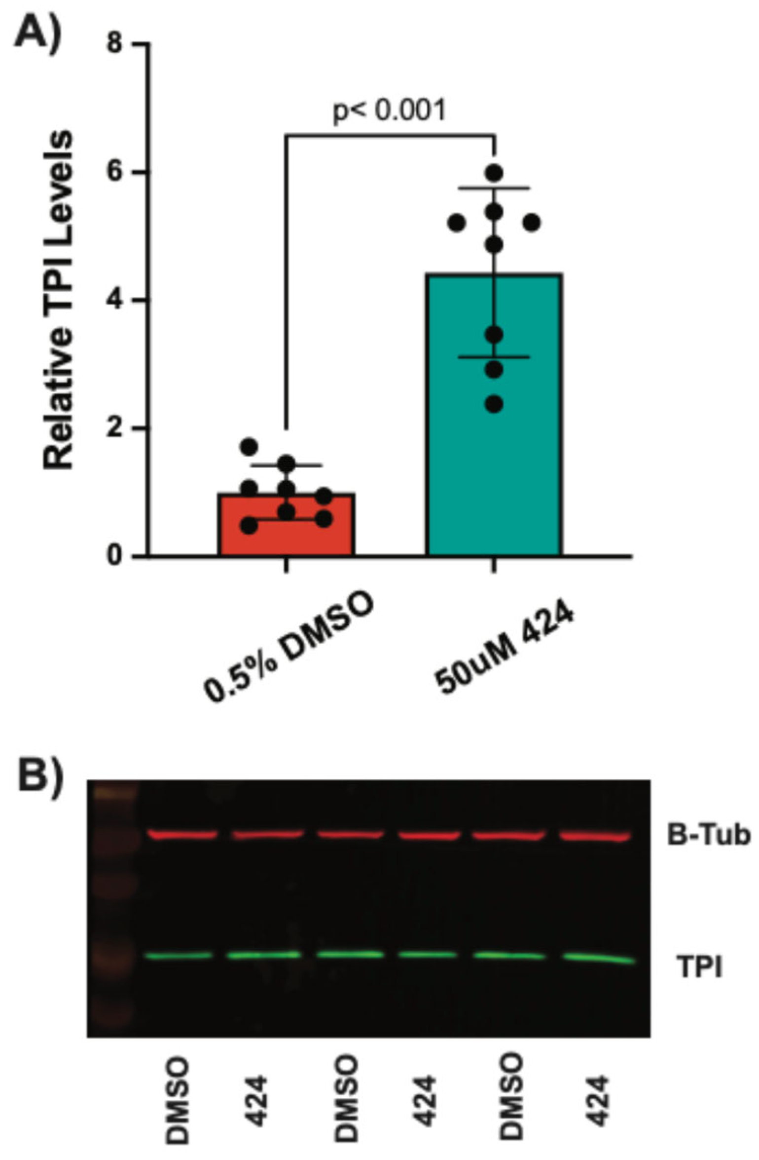 424 (50 μM) for 48 h, harvested, and lysed. Cell lysates were split for bicinchoninic acid assays (BCA) to determine total protein and for TPI activity assays. Compared to the DMSO control, treatment with