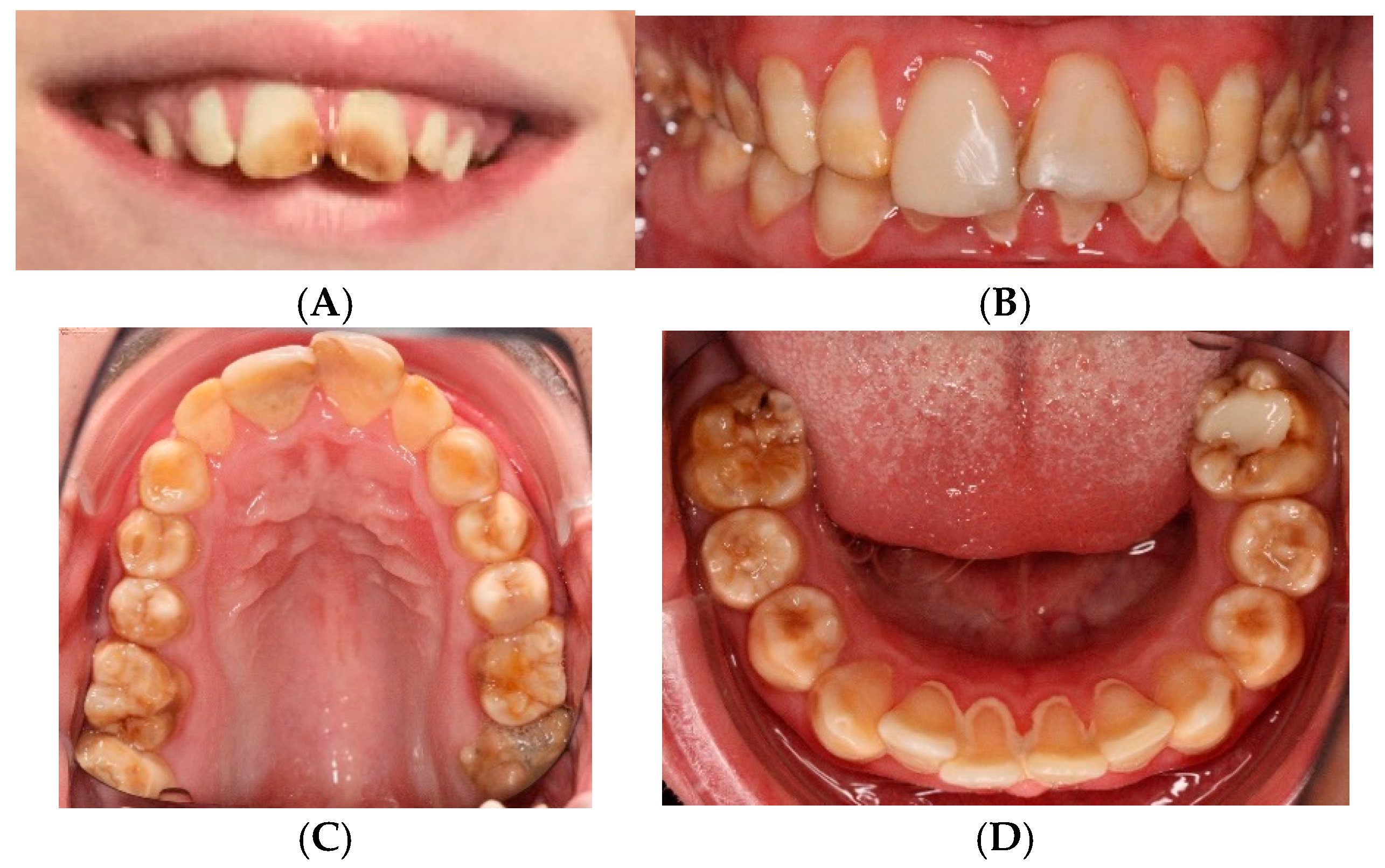 - Bloch-Zupan, A.; Rey, T.; Jimenez-Armijo, A.; Kawczynski, M.; Kharouf, N.; O-Rare consortium; Dure-Molla, M.; Noirrit, E.; Hernandez, M.; Joseph-Beaudin, C.; et al. Amelogenesis Imperfecta: Next-Generation Sequencing Sheds Light on Witkop’s Classification. Front. Physiol. 2023, 14, 1130175. [Google Scholar] [CrossRef]