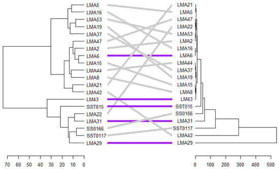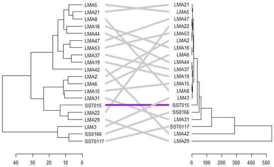 - Galili, T. Dendextend: An R package for visualizing, adjusting and comparing trees of hierarchical clustering. Bioinformatics 2015, 31, 3718–3720. [Google Scholar] [CrossRef]