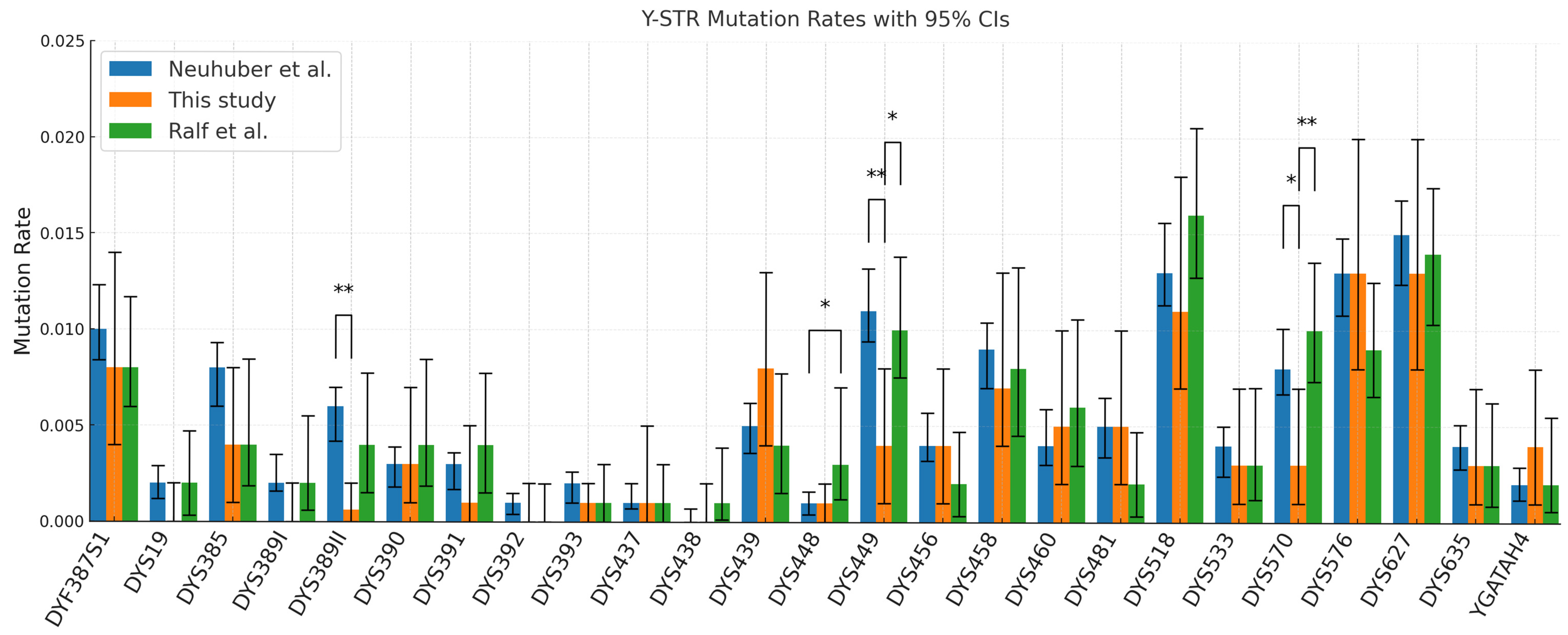 - Ballantyne, K.N.; Goedbloed, M.; Fang, R.; Schaap, O.; Lao, O.; Wollstein, A.; Choi, Y.; van Duijn, K.; Vermeulen, M.; Brauer, S.; et al. Mutability of Y-Chromosomal Microsatellites: Rates, Characteristics, Molecular Bases, and Forensic Implications. Am. J. Hum. Genet. 2010, 87, 341–353. [Google Scholar] [CrossRef]