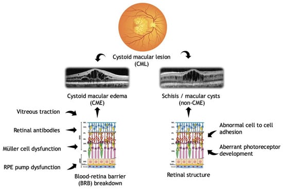 Pathophysiology of cystoid macular lesions subclassified into CME and non-CME lesions (created using BioRender.com).
