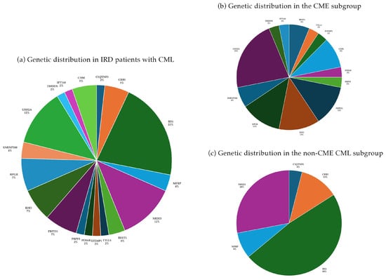 Genetic distribution in the overall IRD cohort of the study (a) and in the two subgroups: (b) patients with cystoid macular edema (CME) and (c) patients with non-CME (schisis-like) cystoid macular lesions (CML).
