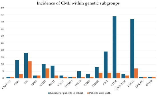 Incidences of cystoid macular lesions (CML) within the different genetic subgroups observed in our study. The blue columns show the total number of patients in each genotype group, while orange columns demonstrate the number of patients affected with CML within each group.