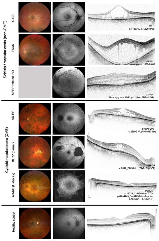 Retinal imaging in inherited retinal diseases (IRDs) showing different forms of cystoid macular lesions (CMLs). From left to right: color fundus images (Clarus 700, Carl Zeiss AG, Oberkochen, Germany), fundus autofluorescence and OCT images (Spectralis, Heidelberg Engineering, Heidelberg, Germany). The IRD due to mutations in MFRP includes the following: nanophthalmus, retinal degeneration, foveoschisis, and optic disc drusen. AD-RP: autosomal dominant retinitis pigmentosa, AR-RP: autosomal recessive retinitis pigmentosa, ESCS: enhanced S-cone syndrome, XLRP: X-linked retinitis pigmentosa, and XLRS: X-linked retinoschisis. The lower panel shows images of a healthy control for comparison.