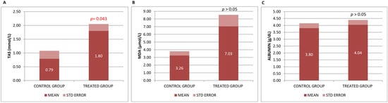 (A) Total antioxidant status (TAS), (B) MDA and (C) albumin levels in serum. Data are shown as mean ± SEM. Statistical significance was determined by Student’s t-test: * p < 0.05.