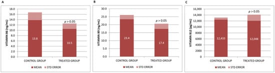 (A) Vitamin B6, (B) Vitamin B9, and (C) Vitamin serum concentrations. Data are shown as mean ± SEM. Statistical significance was determined by Student’s t-test: * p < 0.05.