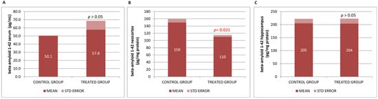 β-Amyloid 1-42 (βA42) protein levels were analyzed since they are associated with cerebral amyloidosis and cognitive decline with progression to dementia in patients and are currently considered the most specific marker for Alzheimer’s dementia []. Neurons derived from Alzheimer’s patients showed higher levels of extracellular amyloid types βA42 and βA40 []. High levels of basal amyloid in the brain were associated with lower simultaneous visual memory and more pronounced declines in language, visuospatial ability, and mental status. Amyloid pathology, like neurodegeneration, has been shown to have detrimental, and in part synergistic, effects on cognitive status. Plasma βA42 concentrations and the βA42/βA40 ratio have been recognized as potential indicators of AD-related pathology in cognitively normal individuals reporting subjective cognitive impairment (SCI) []. In one study including participants with SCI, mild cognitive impairment (MCI), and AD dementia and cognitively healthy controls, weak positive correlations were observed between plasma and cerebrospinal fluid (CSF) βA42 and βA40 levels. In contrast, plasma βA42 showed a negative correlation with neocortical amyloid deposition as measured by PET imaging. Plasma βA42 and βA40 levels were reduced in AD dementia compared to all other diagnostic groups. In the preclinical or prodromal phases of AD, including amyloid-positive controls, subjective cognitive decline (SCD), and mild cognitive impairment (MCI), plasma βA42 concentrations show a moderate decrease, while βA40 levels remain stable. Overall, βA levels in plasma are only slightly reduced at the dementia stage, suggesting that significant alterations in βA metabolism appear later in the periphery than in the brain []. Drawing on prior findings [,,,], our results indicate that Neurofabine-C may exert beneficial effects on cognition, consistent with our βA42 data at both the peripheral (serum) and central (neocortical) levels. Furthermore, we confirm the negative association reported in earlier studies [] between circulating βA42 and amyloid accumulation in the neocortex. Given that (i) βA is a significant constituent of senile plaques, (ii) it plays a central role in the onset and progression of AD, and (iii) numerous in vitro and in vivo studies have shown that βA-induced neuronal and glial damage is mediated by oxidative stress [], we propose that the reduction in brain βA, and the associated improvement in cognitive function may be linked to the enhanced antioxidant capacity observed in treated mice.