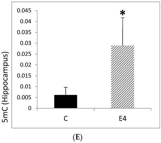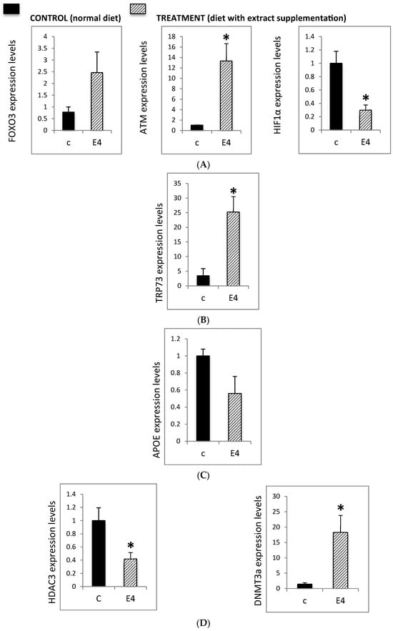 (A) Expression levels of FOXO3, ATM, and HIF1α in hippocampal tissue from 3xTg-AD mice. Mice were fed either a regular diet (C, control, black bars) or a regular diet supplemented with Neurofabine-C (E4, treatment, gray bars) for five weeks. Gene expression was analyzed by qRT-PCR and normalized to a housekeeping gene, expressed as fold change relative to control. Data are shown as mean ± SEM. Statistical significance was determined using Student’s t-test: * p < 0.05. n = 3–5 per group. (B) TRP73 expression levels in hippocampal tissue from 3xTg-AD mice. Mice were fed either a regular diet (C, control, black bars) or a regular diet supplemented with Neurofabine-C extract (E4, treatment, gray bars) for five weeks. Gene expression was analyzed by qRT-PCR and normalized to a housekeeping gene, expressed as fold change relative to control. Data represent mean ± SEM. Statistical significance was determined using Student’s t-test: * p < 0.05. n = 3–5 per group. (C) APOE expression levels in hippocampal tissue from 3xTg-AD mice. Mice were fed either a regular diet (C, control, black bars) or a regular diet supplemented with Neurofabine-C (E4, treatment, gray bars) for five weeks. Gene expression was analyzed through qRT-PCR and normalized to housekeeping genes, expressed as fold change relative to control. APOE expression decreased by approximately 40% following treatment. Data represent mean ± SEM. Statistical significance was determined using Student’s t-test. n = 3–5 per group. (D) Expression levels of epigenetic regulatory enzymes DNMT3A and HDAC3 in hippocampal tissue from 3xTg-AD mice. Mice were fed either regular diet (C, control, black bars) or a regular diet supplemented with Neurofabine-C (E4, treatment, gray bars) for five weeks. Gene expression was analyzed through qRT-PCR and normalized to a housekeeping gene, expressed as fold change relative to control. Data represent mean ± SEM. Statistical significance was determined using Student’s t-test: * p < 0.05. n = 3–5 per group. (E) Global 5-methylcytosine (5mC) levels in hippocampal tissue from 3xTg-AD mice. Mice were fed either a regular diet (C, control, black bars) or a regular diet supplemented with Neurofabine-C (E4, treatment, gray bars) for five weeks. Global DNA methylation was quantified using a colorimetric assay and expressed as 5mC content per hippocampus. Data are presented as mean ± SEM. Statistical significance determined using Student’s t-test: * p < 0.05. n = 3–5 per group.
