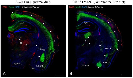 To investigate the preventive neurodegeneration effect of Neurofabine-C supplementation diet on the AD transgenic mice model, we performed an immunofluorescence staining analysis using antibodies against Pax6, as a key marker for differentiation of neural stem cells (Figure 5A,B), and NeuN as a marker for neuronal development.