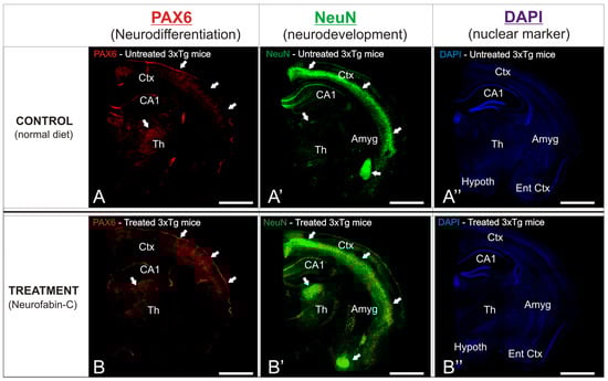 (A,B): Antibodies against Pax6 (red, neurodifferentiation marker) and NeuN (green, neurodevelopmental marker) were used to immunostain sagittal brain slices. DAPI (blue) was used as a counterstain for the nuclei. Images were manipulated to project maximum intensity. The brain’s most immunoreactive areas are indicated by the white arrows. Treated mice were given Neurofabine-C supplementation in the diet. (A’,B’): NeuN immunostaining (green) showing neuronal distribution and density in untreated (A’) and Neurofabine-C–treated (B’) 3xTg mice. (A”,B”): DAPI nuclear counterstaining (blue) illustrating overall cellular distribution in untreated (A”) and treated (B”) 3xTg mice. Scale bars: 100 μm.
