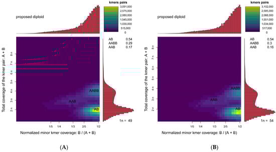 Genome ploidy level analysis of female and male S. japonica. (A) Female. (B) Male. The plots display the heterozygous K-mer distribution for diploid S. japonica. The concentration of points in defined regions is consistent with the features expected for a diploid genome.
