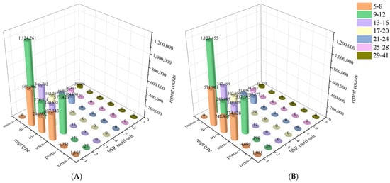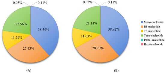 Mononucleotide repeats were the most abundant in the female (38.59%) and male (38.92%) genomes, and hexanucleotide repeats were the least common. Generally, the number of SSRs decreases with the length of the repeating unit []. In this study, the proportion of tetranucleotide repeats was higher than the proportion of trinucleotide repeats in both female and male genomes. This may stem from the ease with which tetranucleotide repeats can be amplified and accumulate in non-coding regions []. The expansion and accumulation of tetranucleotide motifs may be facilitated by the high proportion of non-coding sequences. Overall, SSR types and frequencies were highly similar in female and male S. japonica genomes.