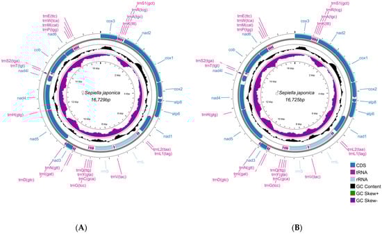 Mitochondrial map of female and male S. japonica. (A) Female. (B) Male. The first and second circles display the CDSs, rRNAs, and tRNAs located on both the positive and negative strands. The third circle represents the GC content. The inward-facing peaks of the circle indicate that the GC content was lower than the average value of the entire genome, and the outward-facing peaks indicate increases in the GC content relative to the average value of the genome. The fourth circle shows the GC-skew value.