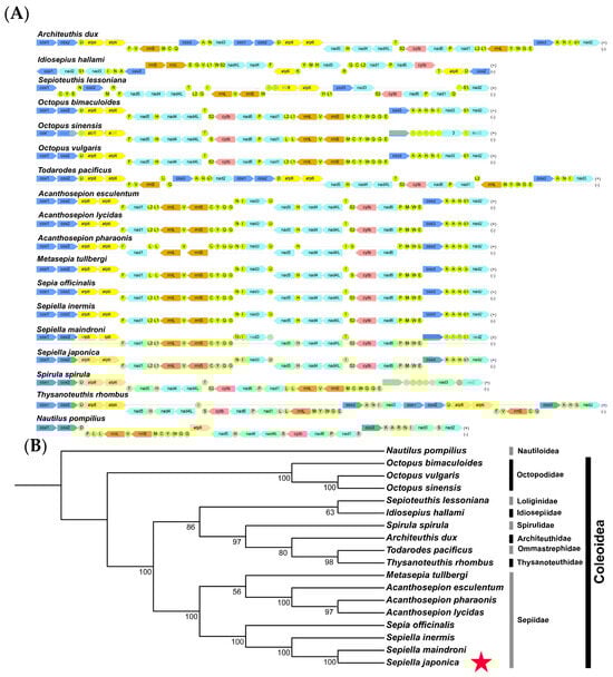 The phylogenetic tree reconstructed from the nucleotide sequences of thirteen PCGs using IQ-TREE in PhyloSuite. (A) The gene orders of the concatenated nucleotide sequences of protein-coding genes (PCGs) for different species. (B) The phylogenetic tree of cephalopod species based on mitochondrial protein-coding genes. Clade groupings indicate family taxonomy. Numbers on the branches represent bootstrap values (red star indicates the study species).