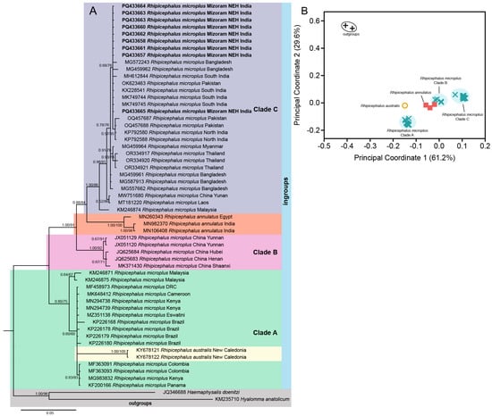 (A) Bayesian inference (BI) phylogenetic tree of the mitochondrial COX1 marker in assigning R. microplus as the ingroup while keeping H. doenitzi and Hyalomma anatolicum as outgroups. The posterior probability (PP) support values from the BI tree are given at each branch, and the ultrafast bootstrap (UFB) support for the corresponding branch from the maximum likelihood (ML) inference tree is also given beside the PP values as PP/UFB. (B) Ordination of standardized p-distance (COX1) among the ingroup and outgroup taxa along the principal coordinate (PCo) axes where a total of 61.2% and 29.6% of the variance are captured by PCo1 and PCo2, respectively.