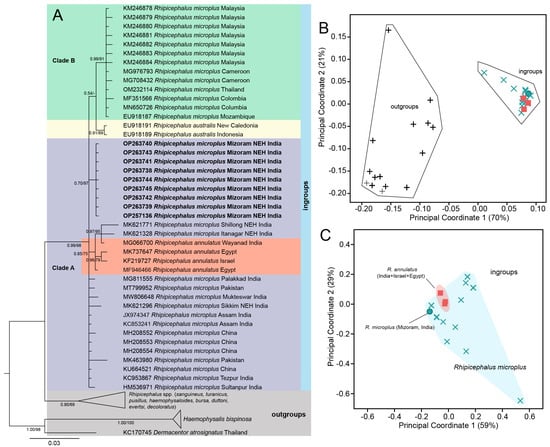 (A) Bayesian inference (BI) phylogenetic tree of the mitochondrial 16S rDNA marker in ixodid ticks with assigning R. microplus and R. annulatus as ingroups while keeping H. bispinosa, Dermacentor and other Rhipicephalus species as outgroups. The posterior probability (PP) support values from the BI tree are given at each branch, and the ultrafast bootstrap (UFB) support for the corresponding branch from the maximum likelihood (ML) inference tree is also given beside the PP values as PP/UFB. The unsupported branching from the ML tree is denoted as dash (PP/–). (B) Ordination of standardized p-distance (16S rDNA) among the ingroup and outgroup taxa along the first and second principal coordinate (PCo) axes, where a total of 70% and 21% of the variance are captured by PCo1 and PCo2, respectively. (C) Ordination of standardized p-distance among the ingroup taxa along the first and second principal coordinate (PCo) axes, where a total of 59% and 29% of the variance are captured by PCo1 and PCo2, respectively.