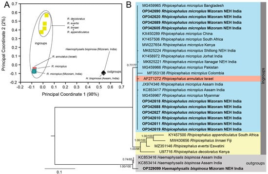 (A) Ordination of standardized p-distance (ITS-2) among the ingroup and outgroup taxa along the first and second principal coordinate (PCo) axes where a total of 98% and 2% of the variance are captured by PCo1 and PCo2, respectively. (B) Bayesian inference (BI) phylogenetic tree of the nuclear ITS-2 marker in ixodid ticks with Rhipicephalus species assigned as ingroups while keeping Haemophysalis bispinosa as an outgroup taxon. The posterior probability (PP) support values from the BI tree are given at each branch, and the ultrafast bootstrap (UFB) support for the corresponding branch from the maximum likelihood inference tree is also given beside the PP values as PP/UFB.