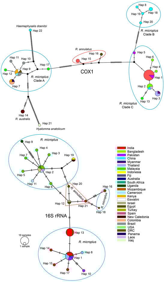 Secondly, using PCoA, the mitochondrial 16S rDNA dataset of R. microplus of this study, isolates from India, certain isolates from China, and R. annulatus were grouped into clade A, while we assigned R. microplus from Malaysia, Cameroon, Thailand, Columbia, and Mozambique together with R. australis into clade B; and the other Rhipicephalus spp., H. bispinosa and Dermacentor atrosignatus as outgroups (Figure 3A). The constructed phylogenetic tree exhibited a well-supported clade that encompassed both R. microplus and R. annulatus with respect to the outgroups (PP = 0.99; UFB = 78). Notably, all of the tick samples from Mizoram (India) were clustered together, forming a sub-clade (PP = 0.70; UFB = 97). Interestingly, R. annulatus appeared to be cohesively clustered among R. microplus (Figure 3B,C). Considering this clustering pattern from PCoA, we estimated the haplotype diversity among the ingroup samples (Table 2), disclosing the existence of 21 distinct haplotypes with a haplotype diversity value (hd) of 0.8995; within R. microplus, 18 distinct haplotypes with an hd of 0.8804 were recovered. Intriguingly, all Mizoram samples were contained within a single haplotype (Hap 13) (Figure 6). This study retrieved seven (7) haplotypes from India, four (4) of which were from the NEH region (Hap 13, 16, 17, and 18). The haplotypes of R. annulatus were nested and interconnecting with R. microplus haplotypes from India (Hap 21), Israel (Hap 12), and Egypt (Hap 12, 20).