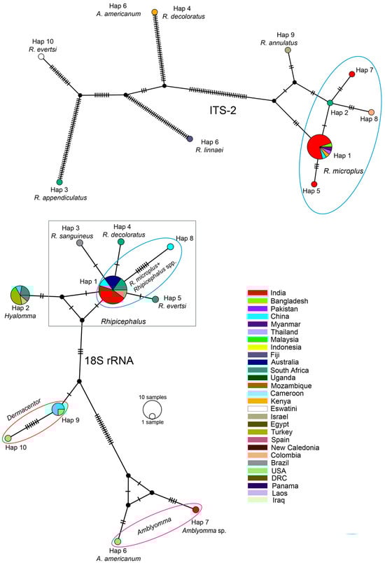 Median-joining haplotype networks based on the nuclear 18S rDNA and ITS-2 markers in ixodid ticks. Numbers at the branch represent mutational steps found between haplotypes, and black dots at the branches are either inferred missing or unsampled steps. The different color codes denote the different countries where the samples originate from.
