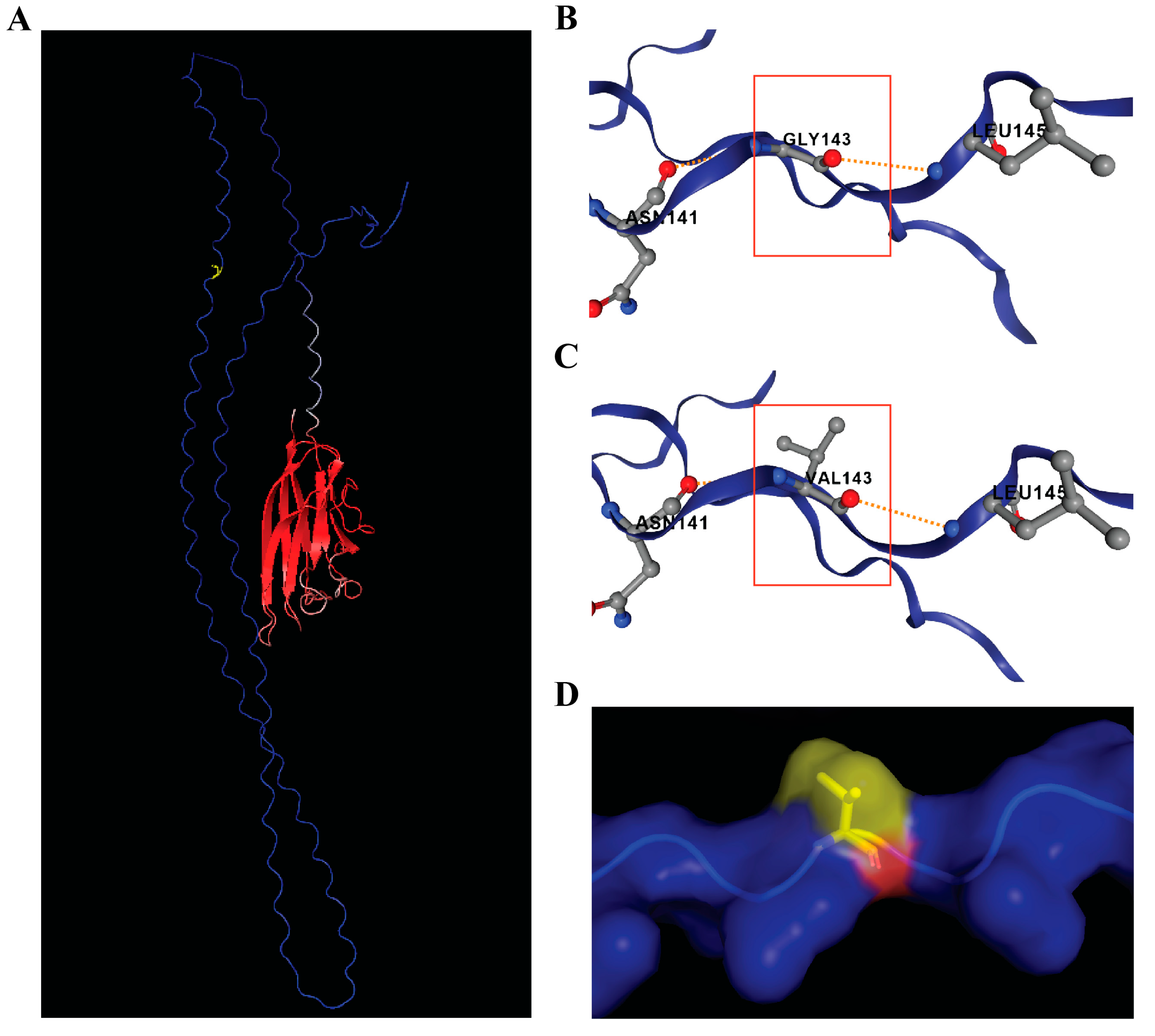C1QTNF9 | 13 | 4 | NM_001303138:c.G428T | p.G143V | Nonsynonymous SNV | 23.0 | 0.944 | D (0.001) | D (1.0) | D (1.0) |