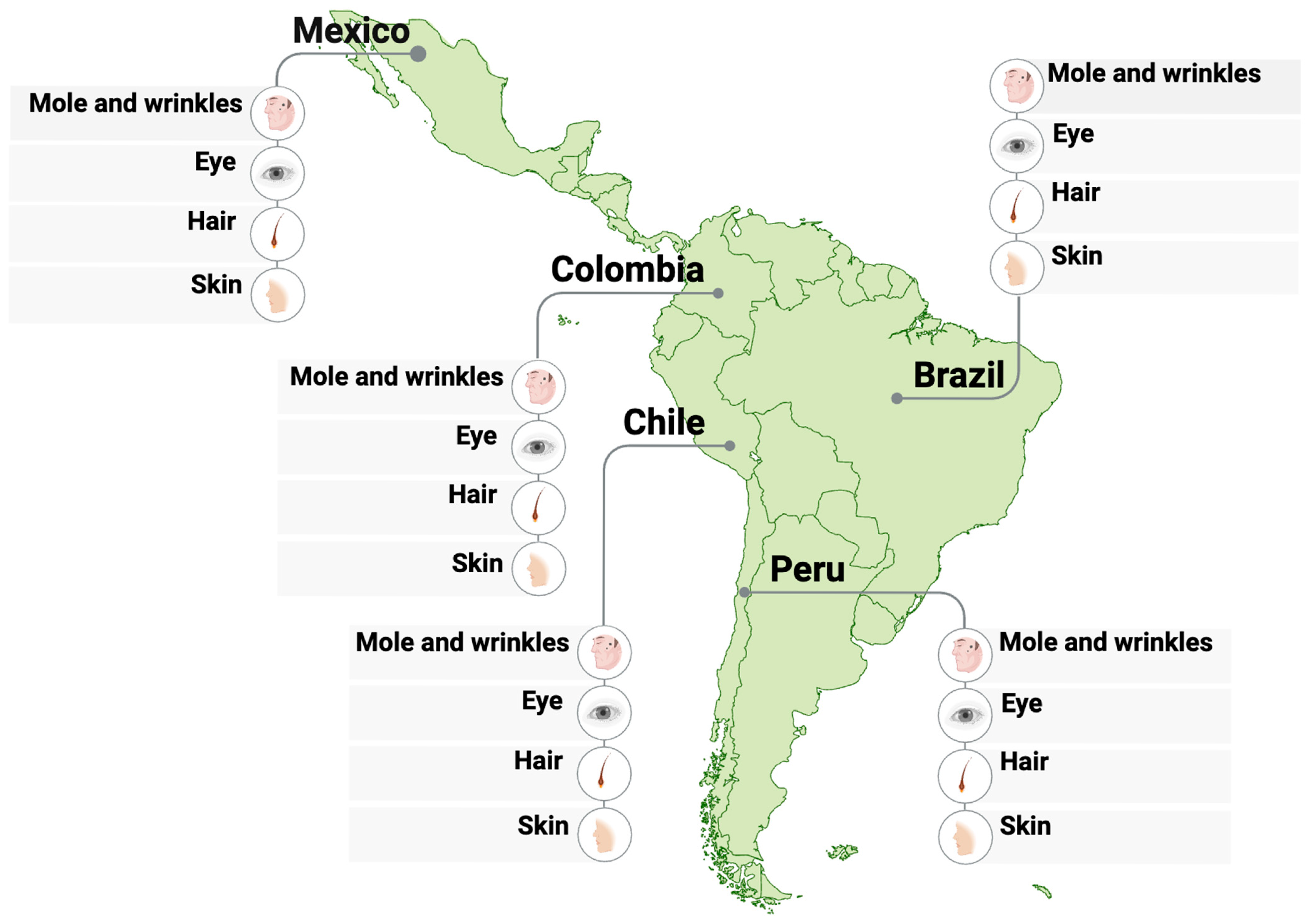 - Chen, Y.; André, M.; Adhikari, K.; Blin, M.; Bonfante, B.; Mendoza-Revilla, J.; Fuentes-Guajardo, M.; Palmal, S.; Chacón-Duque, J.C.; Hurtado, M.; et al. A genome-wide association study identifies novel gene associations with facial skin wrinkling and mole count in Latin Americans. Br. J. Dermatol. 2021, 185, 988–998. [Google Scholar] [CrossRef]