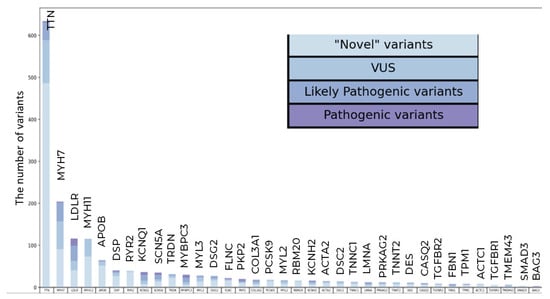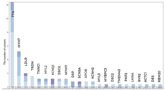 The highest number of variants was found in TTN—0 PVs, 3 LPVs, and 28 VUSs—and in MYH7—0 PVs, 2 LPVs, and 11 VUSs (Figure 4).