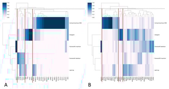 (A,B) Heatmaps with hierarchical clustering, where the y-axis represents functional variant types and the x-axis represents genes for PVs/LPVs (A) and VUS (B). The color indicates the frequency of each variant type in each gene. The dendrograms cluster genes with similar variant profiles. Gene clusters are highlighted with red lines.
