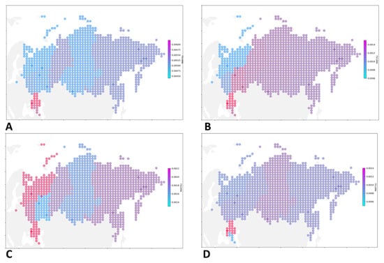 Geographic distribution pf PVS and LPVs associated with cardiovascular diseases. A spatial distribution map illustrating the prevalence of CVD-associated PVs and LPVs in various parts of Russia (A). PVs and LPVs associated with familial hypercholesterolemia (B), PVs and LPVs associated with hypertrophic cardiomyopathy (C), and PVs and LPVs associated with dilated cardiomyopathy (D).