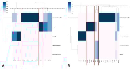 (A,B) Heatmaps with hierarchical clustering, where the y-axis represents functional variant types, and the x-axis represents genes for PVs/LPVs (A) and VUS (B). The color indicates the frequency of each variant type in each gene. The dendrograms cluster genes with similar variant profiles. Gene clusters are highlighted with red lines.