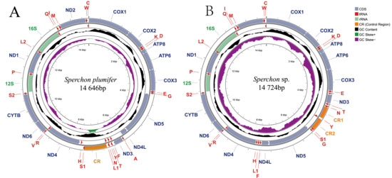 The complete mitochondrial genomes of S. plumifer and Sperchon sp. were sequenced and assembled into circular, double-stranded DNA molecules (Figure 1). The mitogenome of S. plumifer is 14,646 bp in length, while that of Sperchon sp. is 14,724 bp. Both mitogenomes contain the typical set of 37 mitochondrial genes: 13 protein-coding genes (PCGs), 22 transfer RNA (tRNA) genes, and 2 ribosomal RNA (rRNA) genes. The gene distribution across the two strands is conserved in both species. A total of 22 genes is encoded on the majority (J) strand, comprising nine PCGs and thirteen tRNAs. Consequently, the remaining 15 genes are located on the minority (N) strand, including the other four PCGs, nine tRNAs, and both rRNA genes (rrnL and rrnS). The nucleotide composition was highly biased towards A and T, with overall A+T contents of 73.6% in S. plumifer and 73.1% in Sperchon sp. Both genomes exhibited a positive AT-skew (S. plumifer: 0.224; Sperchon sp.: 0.260) and a negative GC-skew (S. plumifer: −0.183; Sperchon sp.: −0.231) on the J-strand, indicating a higher abundance of A over T and C over G. The genomes are compact, with short intergenic spacers and some gene overlaps. In S. plumifer, intergenic spacers range from 1 to 50 bp, while gene overlaps span 1 to 9 bp. Sperchon sp. possesses intergenic spacers range from 1 to 39 bp and gene overlaps span 1 to 8 bp. Detailed information for each gene junction can be found in Tables S1 and S2.