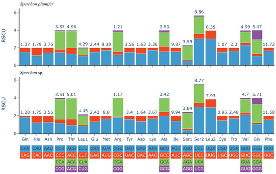 Relative synonymous codon usage (RSCU) in the mitochondrial genomes of Sperchon plumifer and Sperchon sp. The x-axis lists the amino acids, and the y-axis represents the RSCU value. The stacked bars for each amino acid show the RSCU values of its synonymous codons. The color of each segment corresponds to a specific codon, as indicated in the key below the x-axis. The total number of codons for each amino acid is shown above the respective bar.