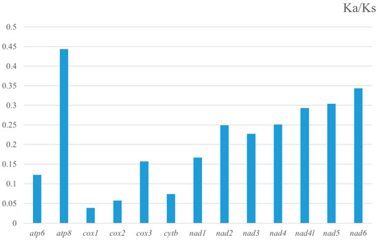 To evaluate the selective pressures on the PCGs, the ratio of nonsynonymous (Ka) to synonymous (Ks) substitution rates was calculated for each gene between the two species (Figure 3). All Ka/Ks ratios were substantially below 1, ranging from 0.039 (cox1) to 0.444 (atp8), indicating that all 13 PCGs are evolving under strong purifying selection. The intensity of this selection pressure, however, varied among genes. The PCGs ranked from most to least conserved were: cox1 < cox2 < cob < atp6 < cox3 < nad1 < nad3 < nad2 < nad4 < nad4L < nad5 < nad6 < atp8. This identifies cox1 as the most conserved gene, while atp8 is evolving under the most relaxed purifying selection.