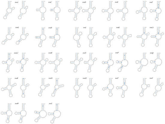 The full complement of 22 tRNA genes was identified in both Sperchon mitogenomes, with lengths ranging from 49 to 64 bp (average was 56.2) in S. plumifer and 50 to 61 bp (55.9) in Sperchon sp. (Tables S1 and S2). A pervasive loss of the canonical cloverleaf secondary structure was observed in the majority of these tRNAs (Figure 4). Only a minority of tRNAs could be folded into a typical cloverleaf shape. Specifically, in S. plumifer, only seven tRNAs (trnD, trnK, trnL1, trnL2, trnM, trnN, trnR) retained a complete cloverleaf structure. Similarly, only six tRNAs in Sperchon sp. (trnD, trnK, trnL1, trnL2, trnM, trnN) were found to be canonical. The majority of tRNAs exhibited highly truncated structures, primarily due to the loss of either the D-arm or the T-arm: six tRNAs in S. plumifer (trnA, trnG, trnI, trnS1, trnS2, trnV) and seven in Sperchon sp. (trnA, trnG, trnI, trnR, trnS1, trnS2, trnV) lacked a D-arm. Nine tRNAs in both Sperchon species (trnC, trnE, trnF, trnH, trnP, trnQ, trnT, trnW, trnY) were missing a T-arm. While the secondary structures of 21 tRNAs were largely conserved between the two species, notable structural differences were observed in trnR. For instance, trnR possessed a full cloverleaf structure in S. plumifer but lacks a D-arm in Sperchon sp. Furthermore, some mismatched base pairs, including G-U, U-U, A-G, A-A, and C-A, were identified across the stem regions of many tRNAs.