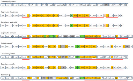 Linearized mitochondrial gene arrangements of seven water mite species, compared with the putative ancestral arrangement of Limulus polyphemus (top). Genes encoded on the N-strand are underlined. The color-coding indicates the type of rearrangement event: orange for translocation only, pink for inversion only, and green for genes that have undergone both translocation and inversion. Control regions (CR) are colored gray. The red lines below the gene blocks highlight conserved clusters shared among the analyzed water mite species.