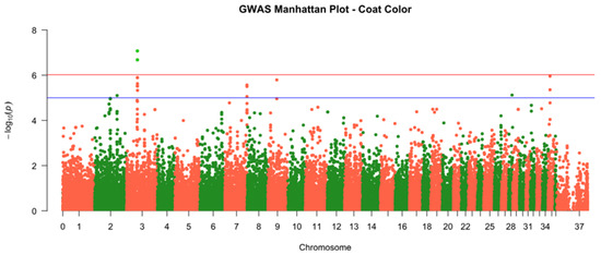 To identify genomic loci associated with infertility and other phenotypic traits recorded in Table 1, genome-wide association studies (GWAS) were conducted using the 55,000-SNP dataset. GWAS results for coat color revealed two significant SNPs on chromosome 3 (SEQ-RS1464642 and SEQ-RS1464884) with P-values in the order of to , demonstrating the power of this approach to pinpoint candidate genes (Figure 1). One of the most important genes was identified is solute carrier family 30 member 2 (SLC30A2) that is linked to the coat melanin synthesis pathway. However, no genomic regions were identified that correlated with infertility status due to lack of sample size (n = 5).