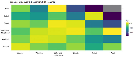 A heat map of pairwise Weir and Cockerham FST values reveals generally low genetic differentiation between breeds (Figure 3). Most pairwise comparisons yield FST estimatesclose to zero or even negative, indicating minimal genetic divergence and substantial gene flow among breeds. The highest differentiation occurs in comparisons involving the Sofor and Majaheem breeds, but even these values remain near zero, suggesting that the sampled camel populations are genetically similar across breeds. These findings are consistent with the expectation that most genetic variation resides within breeds rather than among them.